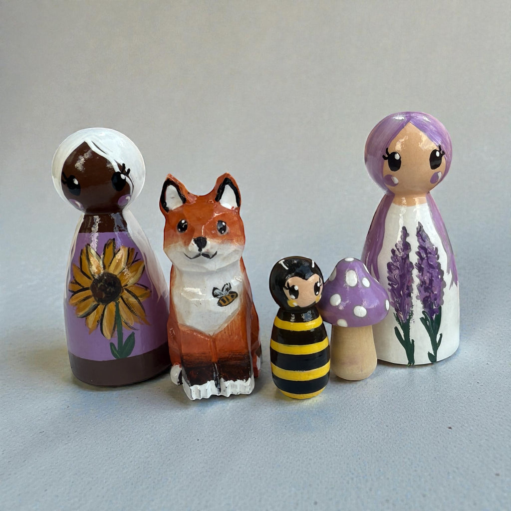Little wooden fox and peg doll friends